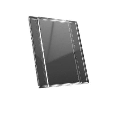 Toploader de plástico semirígido. La carta se introduce deslizando desde el lateral.